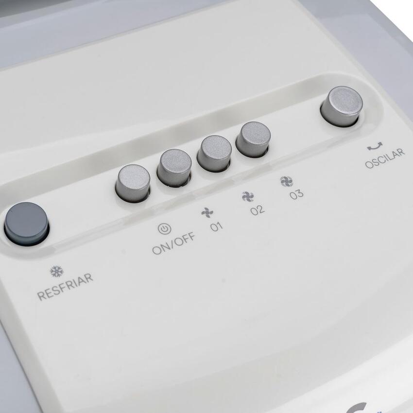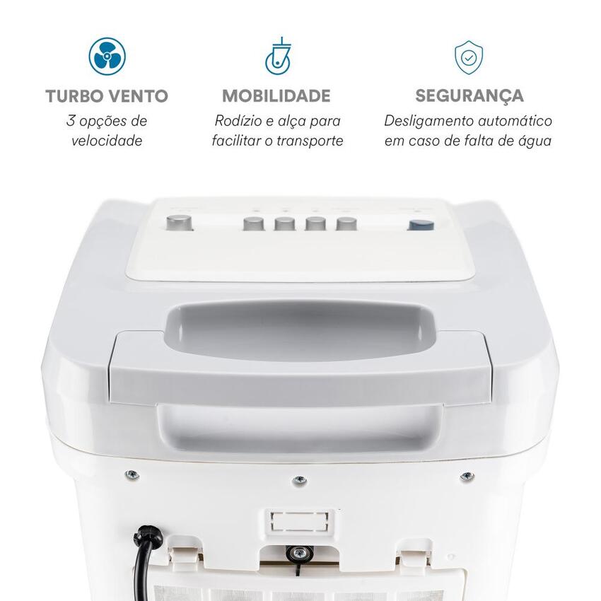 Para garantir um frescor extra, o Artic Fresh inclui um sistema ICE BOX, com duas formas de gel congelante, que intensificam a sensação de ar fresco. Além disso, seu design facilita a mobilidade, contando com quatro rodas para transportar o aparelho facilmente entre diferentes cômodos. A proteção automática da bomba desliga o sistema caso a água acabe, prolongando a durabilidade do equipamento. O reservatório de 3,5 litros permite até 8 horas de uso contínuo, com um prático indicador de nível de água para monitoramento. Com 3 velocidades ajustáveis, controle a intensidade da ventilação conforme suas preferências. A oscilação vertical automática e horizontal manual distribuem o ar de forma uniforme, garantindo um ambiente refrescante por completo.