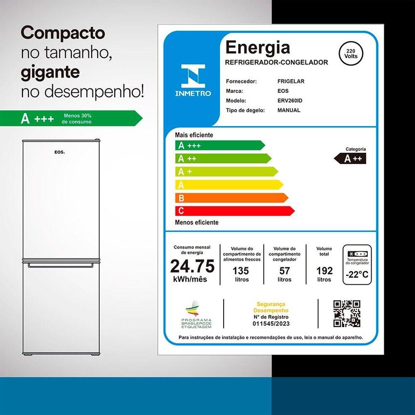 A Geladeira EOS 192 Litros Duplex Inverse oferece praticidade, eficiência e design sofisticado para sua cozinha. Com capacidade total de 192 litros, possui freezer inferior de 57 litros e refrigerador superior de 135 litros, facilitando o acesso aos alimentos mais utilizados. Seu termostato ajustável permite controlar a temperatura entre -22°C e 8°C, enquanto a iluminação LED garante melhor visibilidade. Compacta e silenciosa, essa geladeira combina economia e sustentabilidade, com gás ecológico e eficiência energética A++. Sua estrutura conta com prateleiras ajustáveis e compartimentos estratégicos para melhor organização.