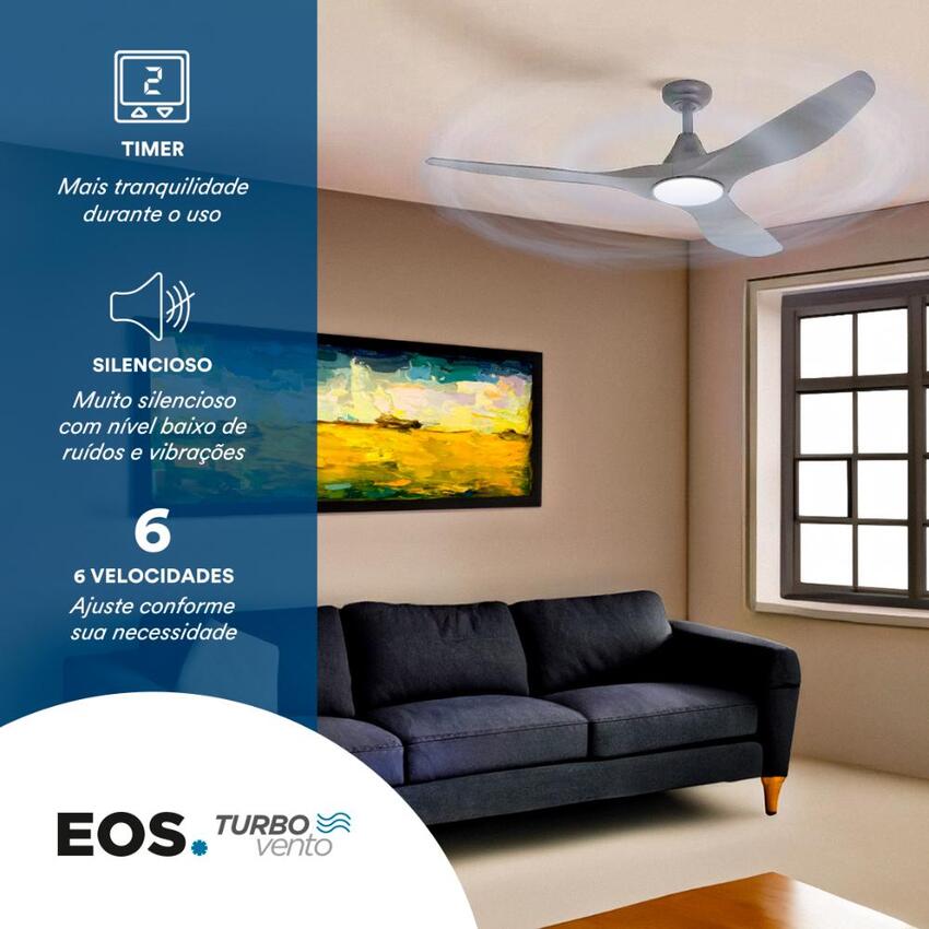 O Ventilador de Teto EOS Turbo Vento 3 Pás combina conforto, eficiência e design moderno para oferecer ventilação potente com baixo consumo de energia. Com 6 veloci...