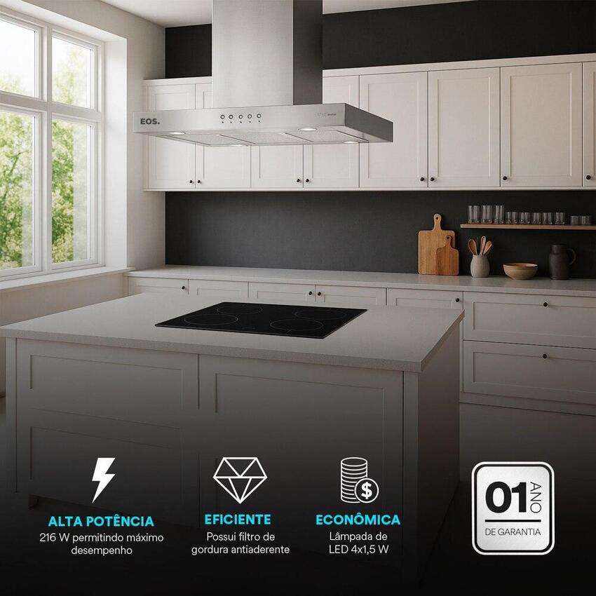 oifa de Ilha EOS Chef Gourmet 90cm é a escolha ideal para quem deseja unir elegância, potência e silêncio em uma cozinha moderna e funcional. Com design tipo T em aço inox premium, ela não é apenas um eletrodoméstic...