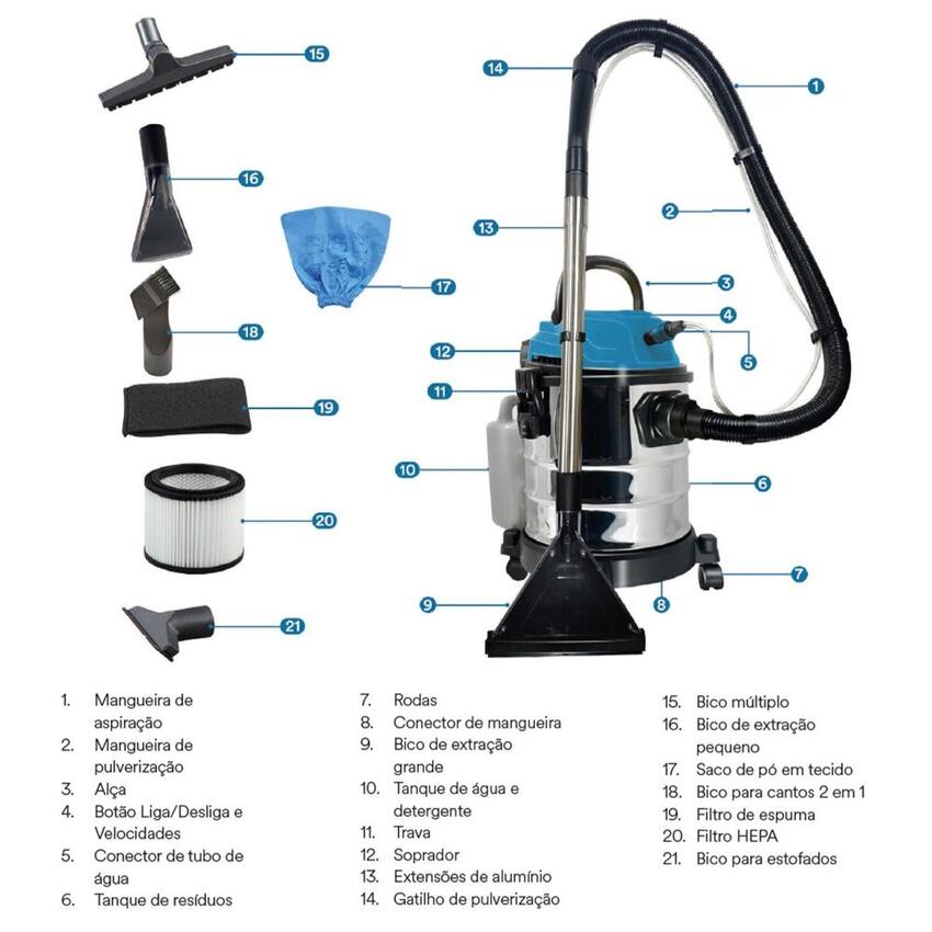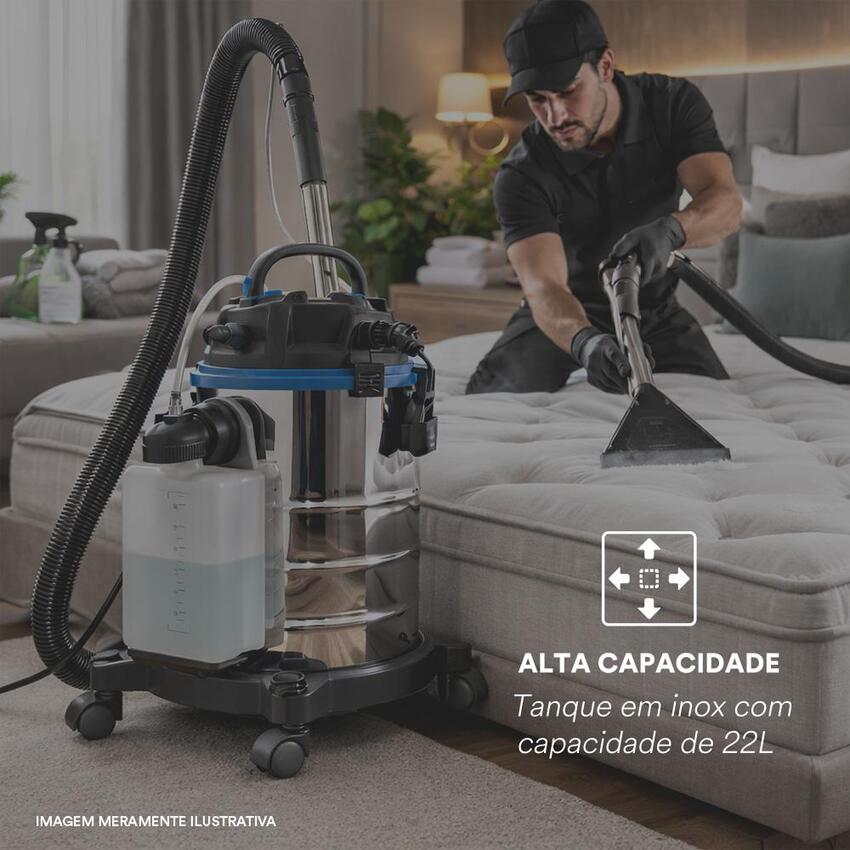 O tanque em inox de 22 litros garante resistência e excelente capacidade para limpezas prolongadas. Conta ainda com mangueira de 1,5 metro e cabo elétrico de 3 metros, proporcionando maior alcance e mobilidade. A filtragem eficiente com filtro HEPA e filtro de espuma contribui para um ambiente mais saudável.