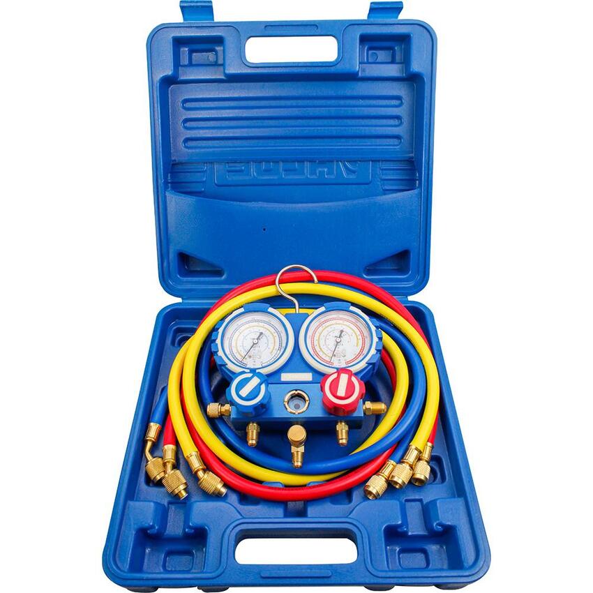 O Manifold Analógico Profissional EOS, também conhecido como Manômetro, é capaz de medir a pressão dos principais fluidos refrigerantes, como o R410A, R22, R134A, R407C.