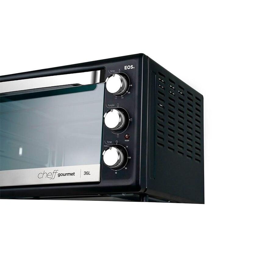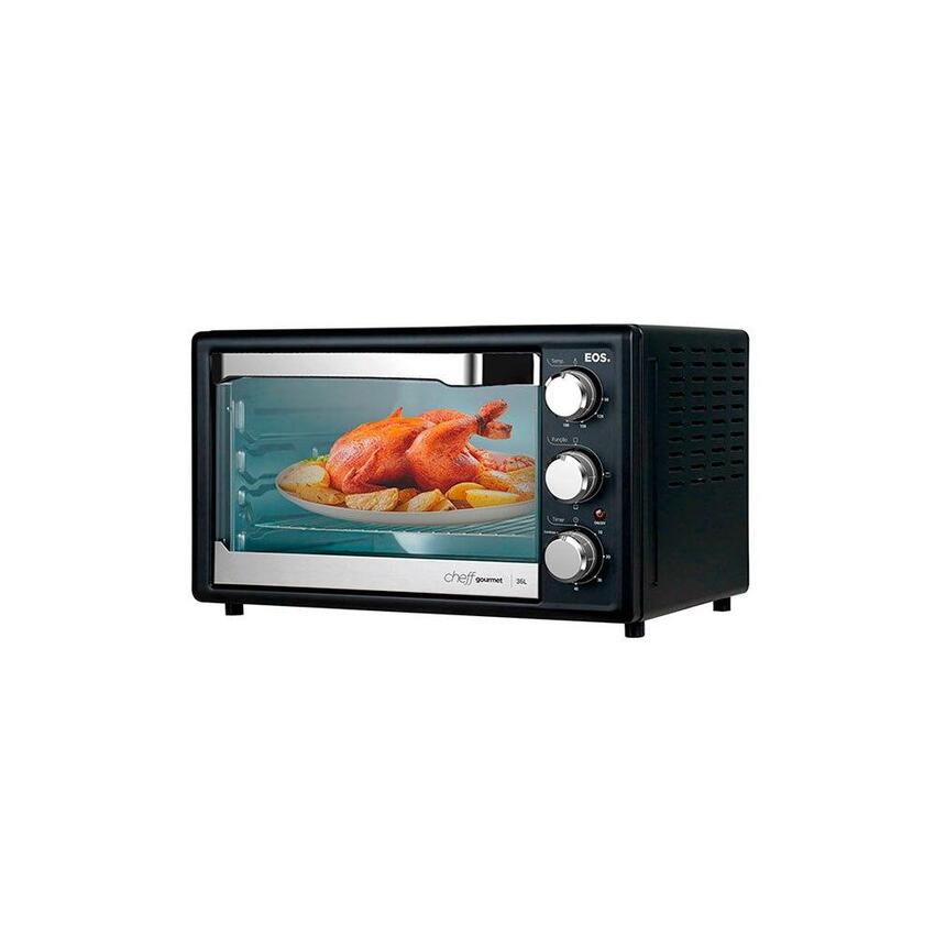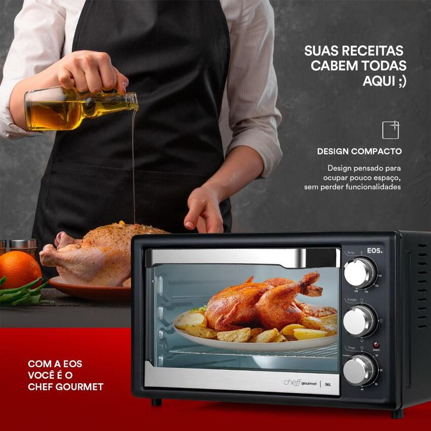 O Forno Elétrico Eos Cheff Gourmet chegou para ajudar você a tornar sua vida muito mais prática e segura. Prático de utilizar, o forno Eos não precisa de instalação, apenas o ligue na tomada e ele já está pronto para deixar suas receitas mais gostosas. Para garantir sua segurança, o forno EOS não precisa de gás, sendo totalmente elétrico, eliminando o risco de vazamentos ou explosões de gás. Seu timer de 60 minutos e controle de temperatura de até 230°C permite mais versatilidade ao preparar suas deliciosas receitas, além de poder controlar qual das duas resistências será utilizada, sendo apenas a superior, a inferior ou ambas - para a perfeita distribuição da temperatura internamente. Principais Características: Prático - Não precisa de instalação, apenas ligar na tomada; Baixo Consumo de energia; Função Grill - Você pode dourar e gratinar seus pratos de forma prática; Alta capacidade interna - 36L de volume; Mais Controle - Você pode ligar apenas a resistência superior, inferior ou ambas; Seletor de temperatura até 230°C; Timer de até 60 min; Antiaderente - muito mais facilidade para limpeza interna.