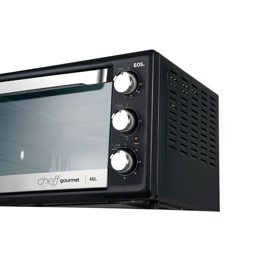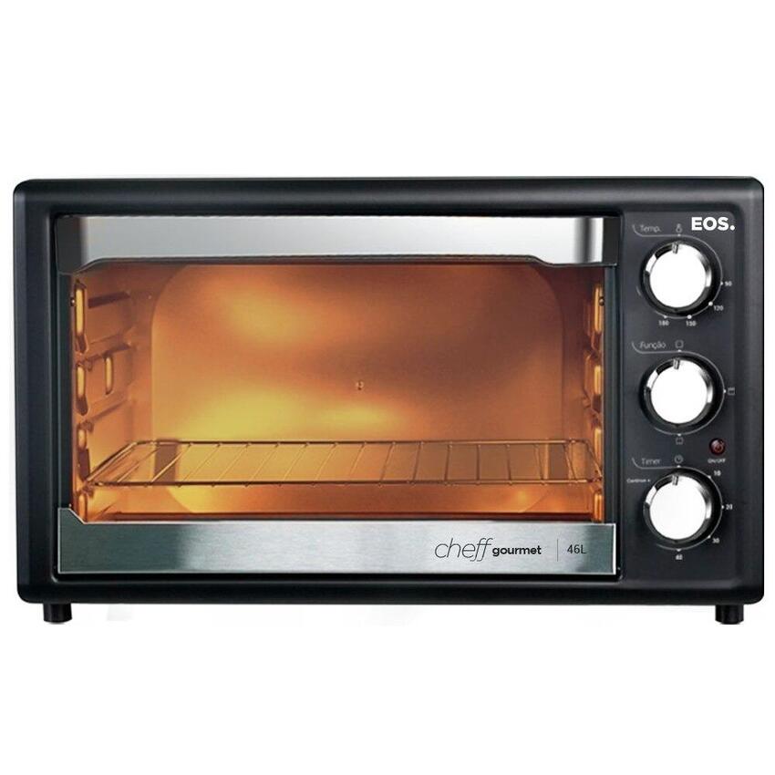 O forno elétrico Eos Cheff Gourmet chegou para ajudar você a tornar sua vida muito mais prática e segura. Prático de utilizar, o forno não precisa de instalação, apenas o ligue na tomada e ele já está pronto para deixar suas receitas mais gostosas. Para garantir sua segurança, o forno EOS não precisa de gás, sendo totalmente elétrico, eliminando o risco de vazamentos ou explosões de gás. Com iluminação interna permite você acompanhar o cozimento sem abrir a porta. Seu timer de 60 minutos e controle de temperatura de até 230°C permite mais versatilidade ao preparar suas deliciosas receitas, além de poder controlar qual das duas resistências será utilizada, sendo apenas a superior, a inferior ou ambas, para a perfeita distribuição da temperatura internamente. Principais Características: Prático - Não precisa de instalação, apenas ligar na tomada; Baixo Consumo de energia; Função Grill - Você pode dourar e gratinar seus pratos de forma prática; Alta capacidade interna - 46 Litros de volume; Mais Controle - Você pode ligar apenas a resistência superior, inferior ou ambas; Luz interna para verificar a comida sem abrir a porta; Seletor de temperatura até 230°C; Timer de até 60 min; Antiaderente - muito mais facilidade para limpeza interna.