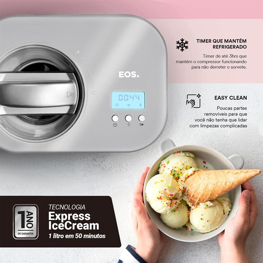 Com a Sorveteira Expressa EOS ESO02S você vai poder fazer receitas incríveis para seus amigos e família, de forma rápida e prática. Por utilizar um compressor para sua refrigeração, a Sorveteira Expressa EOS não requer nenhuma refrigeração prévia, sendo possível fazer o sorvete ao toque de um botão. Seu display de LCD permite que você acompanhe a programação e o tempo de preparo de forma fácil e prática. Você poderá fazer receitas saudáveis e muito saborosas, melhorando a saúde de sua família. A sorveteira EOS permite ainda que você escolha a refrigeração, mistura ou receita de sorvete, fornecendo mais facilidade e autonomia para suas receitas.
