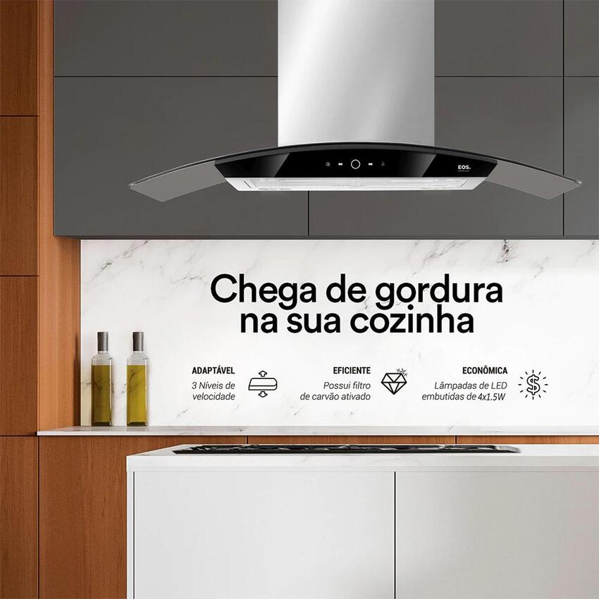 A Coifa de Ilha EOS 90cm ECO90IVD é fabricadas em inox, com acabamento em vidro curvo e conta com a inovadora tecnologia digital touch, para deixar sua cozinha muito mais moderna. Seu controle digital permite uma fácil regulagem de velocidade e controle da iluminação. ...