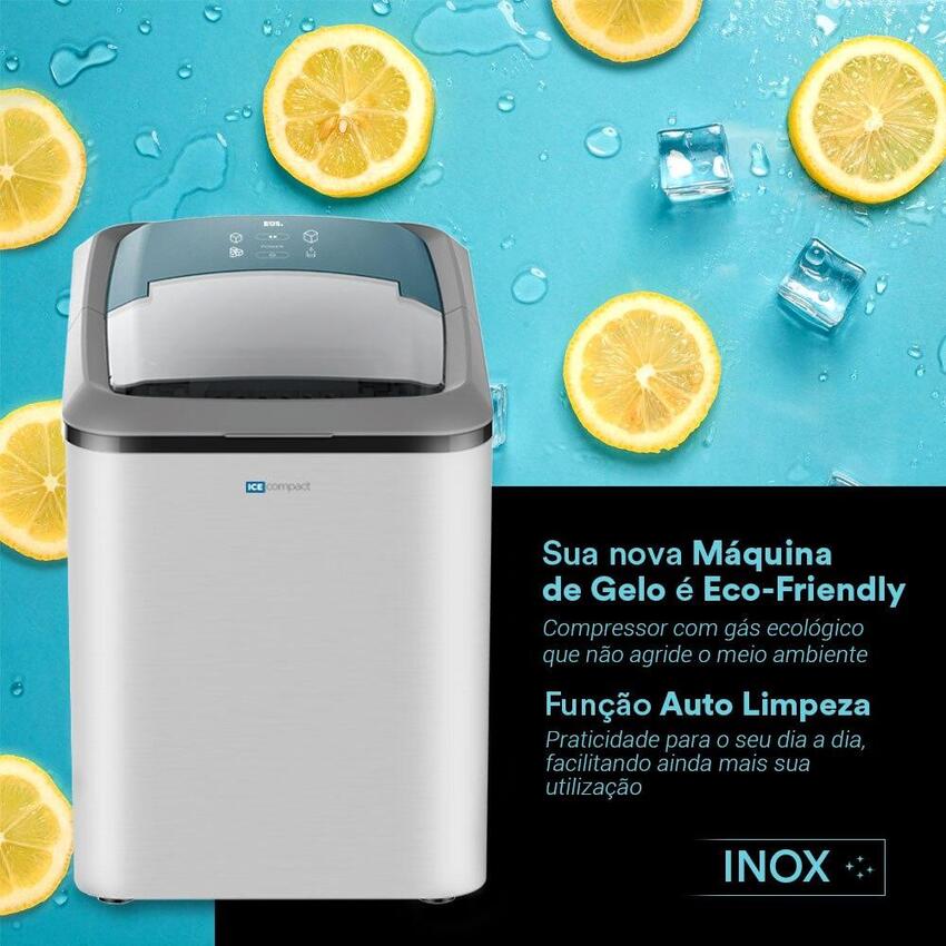Econômica, ecológica e silenciosa! Com a Máquina de gelo EOS Ice Compact você terá gelo em minutos além de produzir até 15kg por dia! Use no seu dia a dia, no churrasco com os amigos, no almoço com a família, leve para a casa de praia ou em seus mais variados eventos. A Máquina de gelo EOS conta com ECO-FRIENDLY, refrigeração por compressor super silencioso com gás ecológico que não agride o meio ambiente. Além disso possui TURBO ICE que produz 9 cubos de gelo a cada 10 minutos.